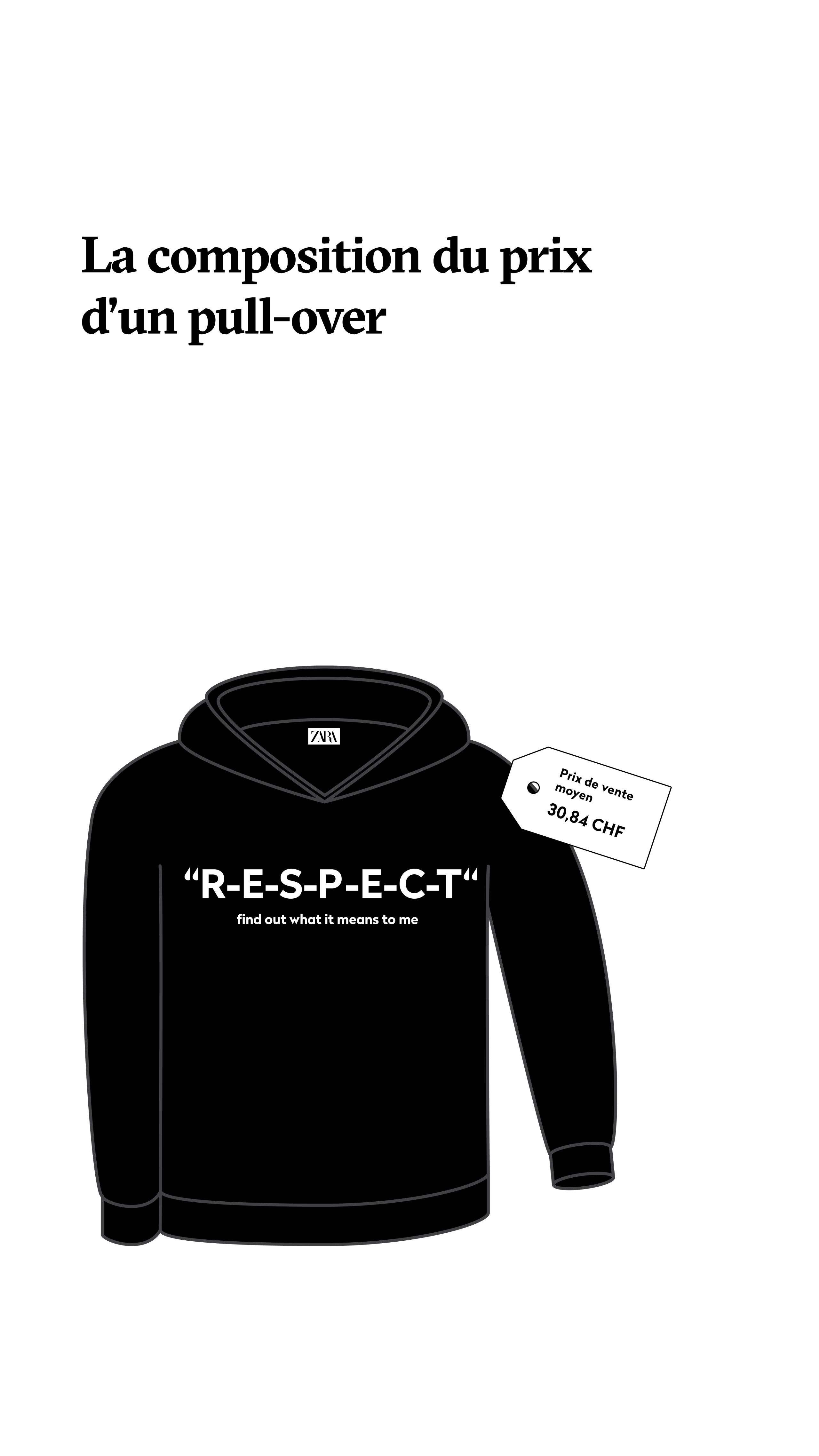 - Zara (respectivement sa maison-mère, Inditex) vend le pull-over « Respect » dans plusieurs pays, pour un prix moyen estimé à plus de 30 francs suisses. Selon nos calculs, le bénéfice dégagé par la société s’élève à 4,86 francs par article (avant déduction des taxes).