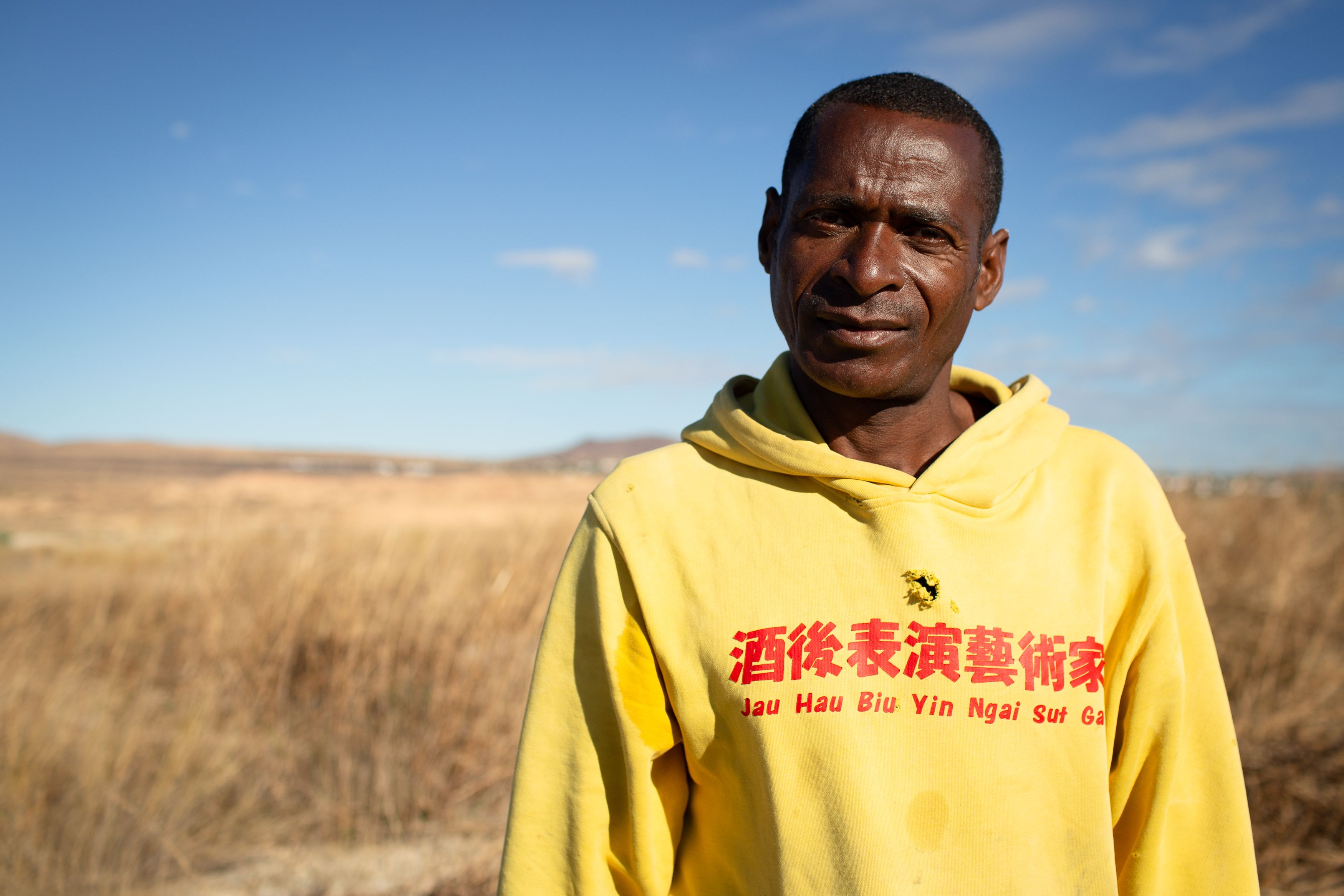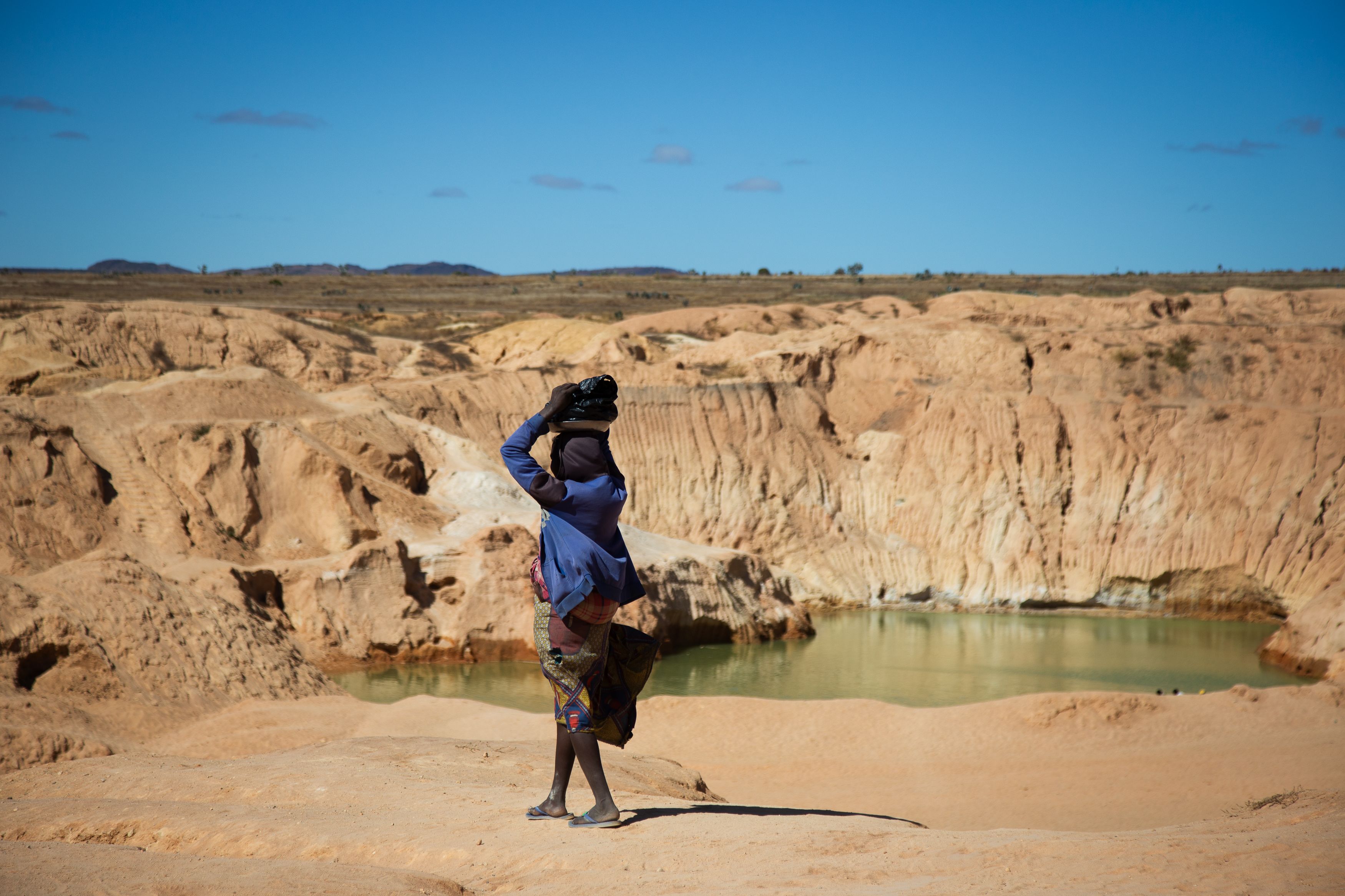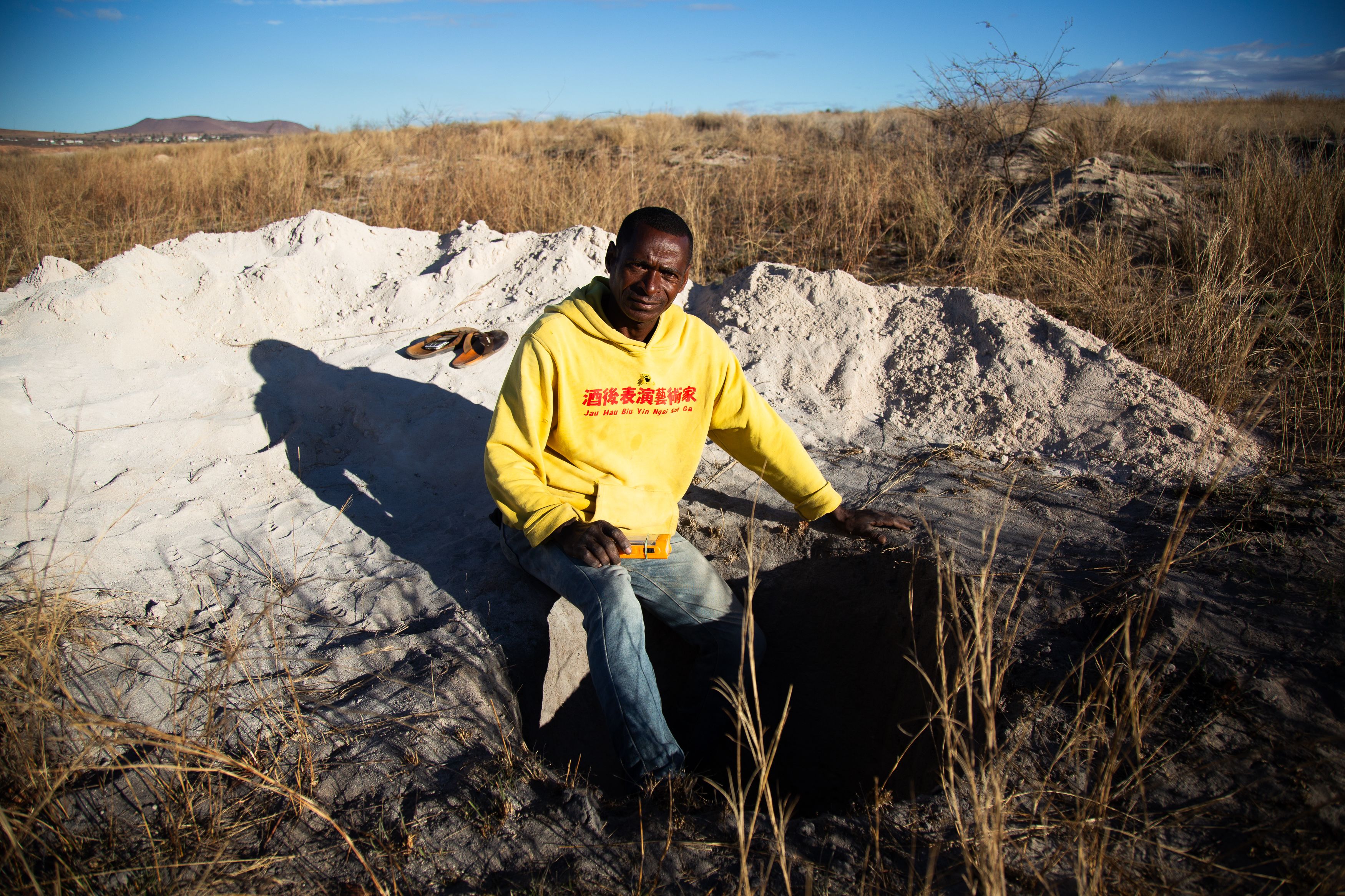 Die Sonne ist gerade aufgegangen. Kinawate, ein 54-jähriger Bergarbeiter, der 1999 nach Ilakaka kam, ist bereits unterwegs. Mit einer Schaufel und einem Strahlstock, einer spitz zulaufenden Eisenstange, macht er sich auf den Weg in Richtung der Minen. Ein grosser, hagerer Körper, schwielige, von der Arbeit gezeichnete Hände und ein warmes Lächeln. Dieser Familienvater, der früher auf einem Fischerboot im Norden des Landes gearbeitet hat, geht schnell, aber nicht hastig. Als er in einer grossen, von Löchern durchzogenen Savannenlandschaft ankommt, macht er sofort die Mine aus, die er mit einem Kollegen betreibt.