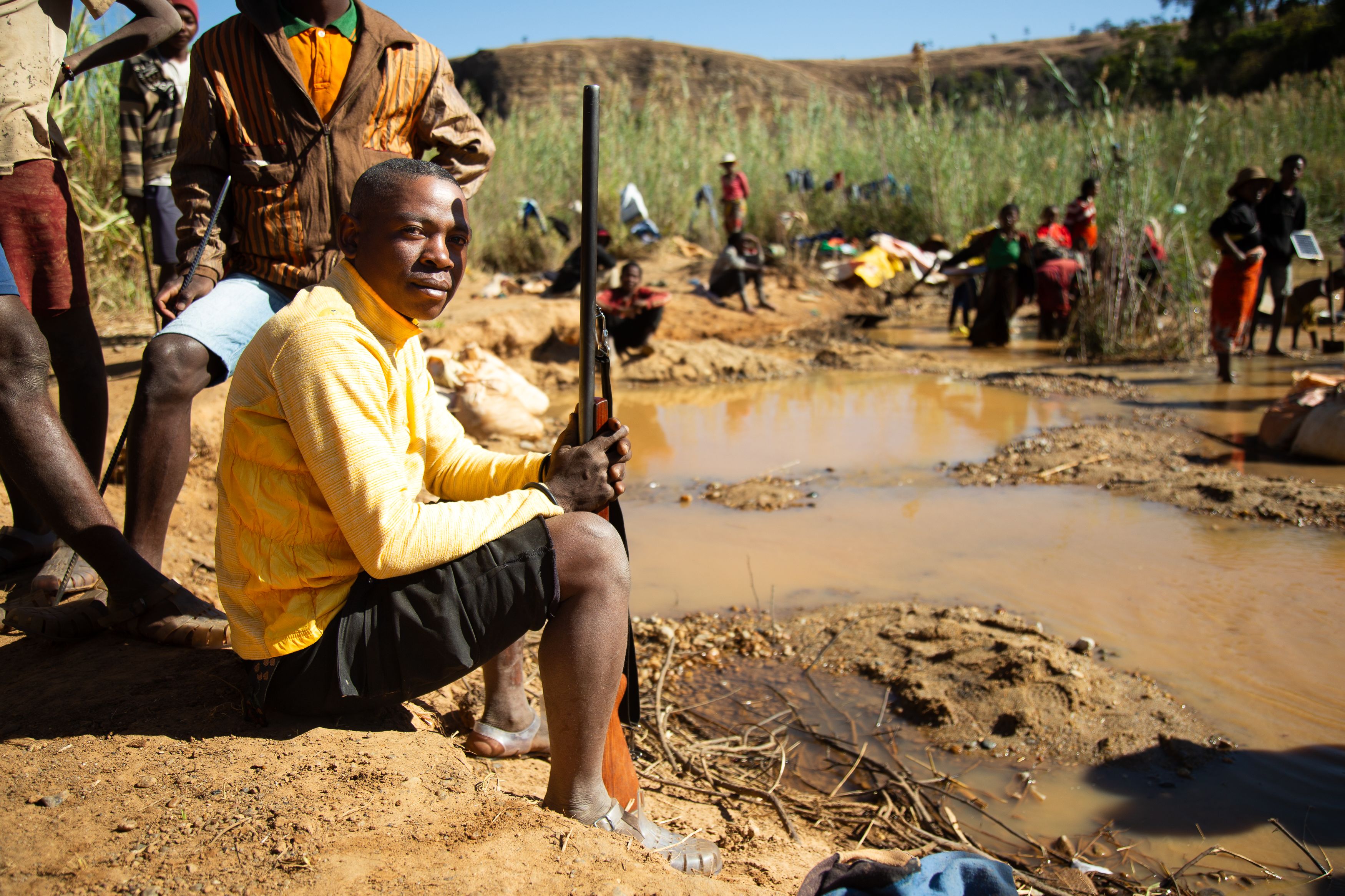 Nachdem sie Erde und Kiesel aus dem Boden geholt haben, waschen die Minenarbeiter von Be Mandresy diese unter den wachsamen Augen ihrer bewaffneten Kollegen im Fluss.