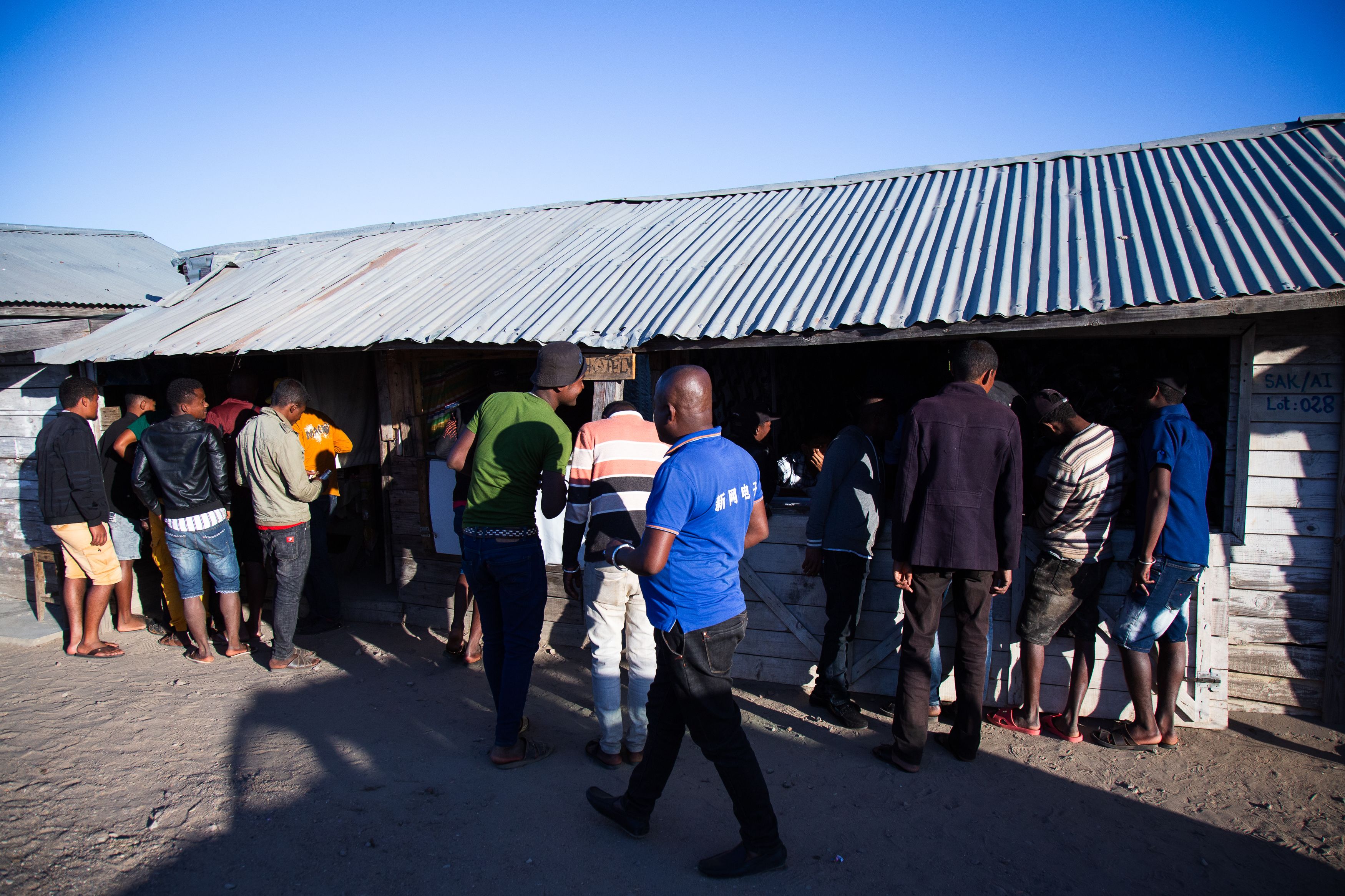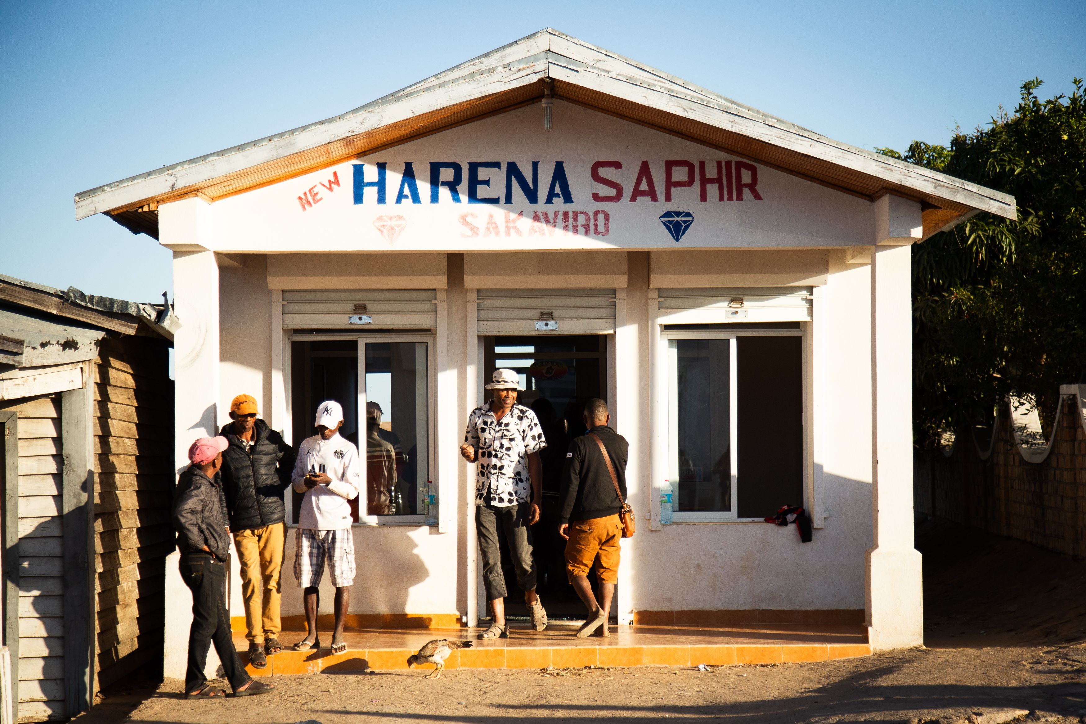 Es ist 15.30 Uhr. Kurz hinter Ilakaka, auf der RN7, beginnt sich Sakaviro zu beleben. Die Ansammlung von Holzhütten und festen Häusern, die wie befestigte Minipaläste aussehen, wurde vor einigen Jahren aus dem Boden gestampft und ermöglicht es Einkäufern aus Sri Lanka und Thailand, die schönsten Steine zu erwerben, noch bevor diese auf ihrem Weg aus der Mine Ilakaka erreichen. Jeden Tag zwischen 16 Uhr und dem Einbruch der Dunkelheit füllt sich Sakaviro mit Minenarbeitern, die auf der Suche nach dem besten Preis von einem Einkaufstresen zum nächsten gehen. Die Stimmung ist hektisch. Der Geruch von Geld liegt in der Luft.