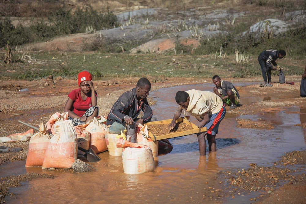 Neben der Mine ist ein Dorf mit einigen Hütten aus Astwerk entstanden. In grossen Töpfen bereiten die Frauen über dem Feuer das Essen zu. Kinder, manche mit aufgeblähten Bäuchen, spielen Fangen. Die älteren Kinder sind zum Fluss gegangen, um ihren Eltern beim Sieben der Kiesel zu helfen. In diesem Dorf, das wie ein Pilz aus dem Boden geschossen ist, gibt es keine Schulen, keinen Strom und keine Latrinen.