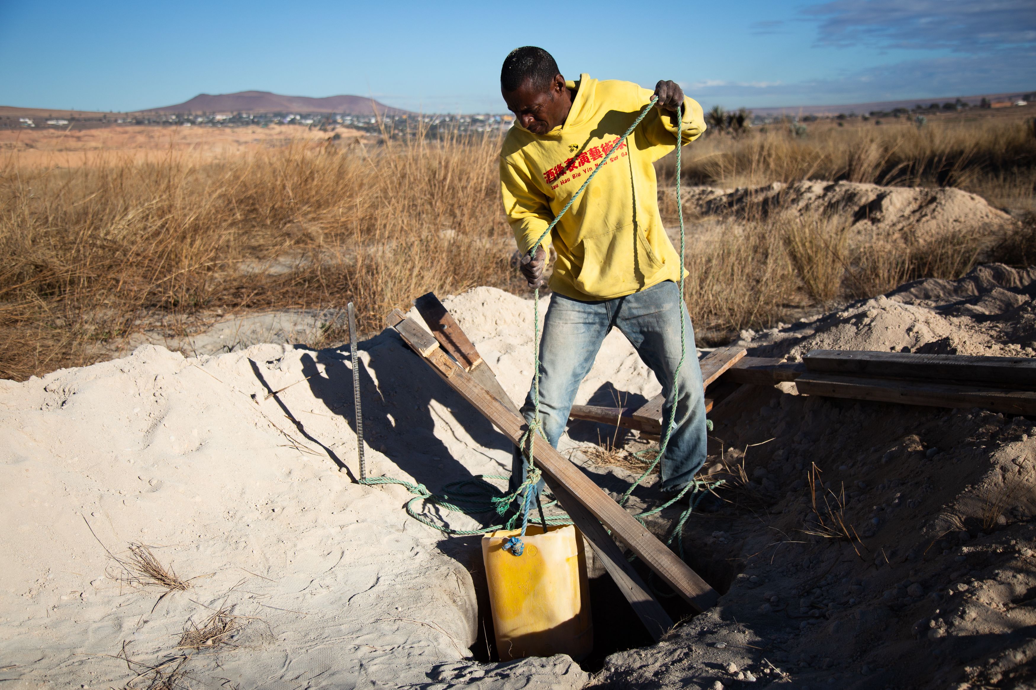 Kinawate baut zunächst einen Flaschenzug aus Holz auf, der mit einem halben Plastikkanister verbunden ist. Die Mine wird nur von ein paar Holzringen und einem Bündel Zweige abgestützt. Der Sand- und Lehmboden ist jedoch brüchig, und Unfälle sind häufig. «Vor zwei Monaten habe ich einen Freund verloren», erzählt er. «Als der Stollen einbrach, wurde er lebendig begraben. Wir haben stundenlang nach ihm gegraben, aber ohne Erfolg.» Wenn er unter die Erde geht, versucht er, nicht an die Gefahr zu denken. «Sonst könnte ich nicht mehr arbeiten», gesteht er.