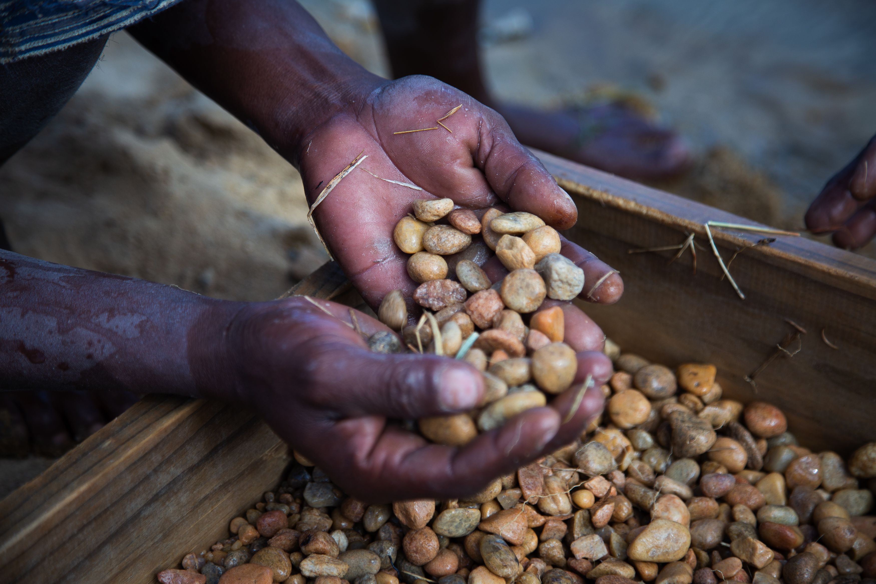 Am Ufer angekommen, waschen sie die Kieselsteine auf einem primitiven Sieb. Dann untersuchen sie die kleinen runden Steine und heben sie in der Hoffnung, einen von ihnen in der Sonne glitzern zu sehen, handvollweise hoch, bis auch der letzte Sack leer ist.