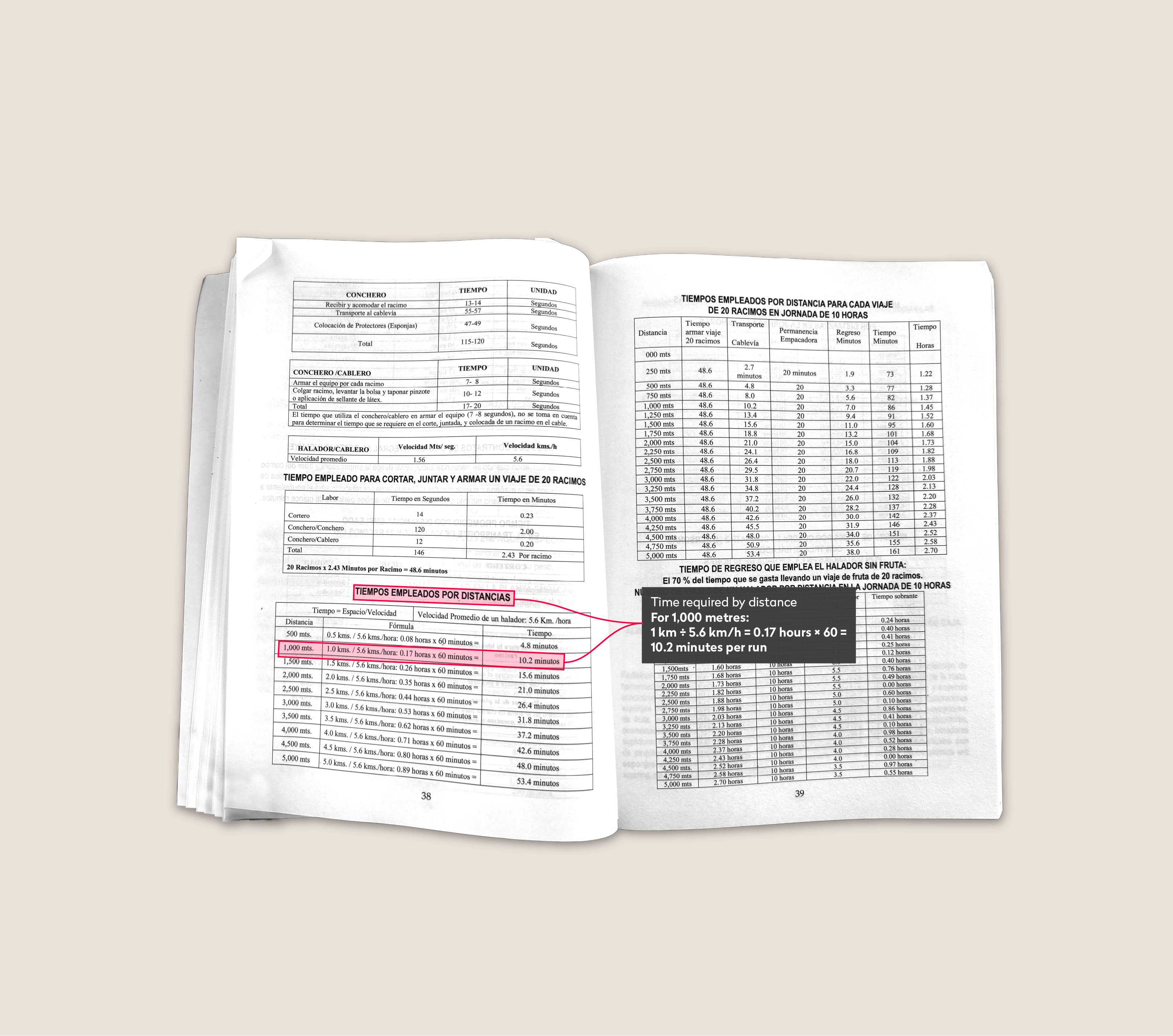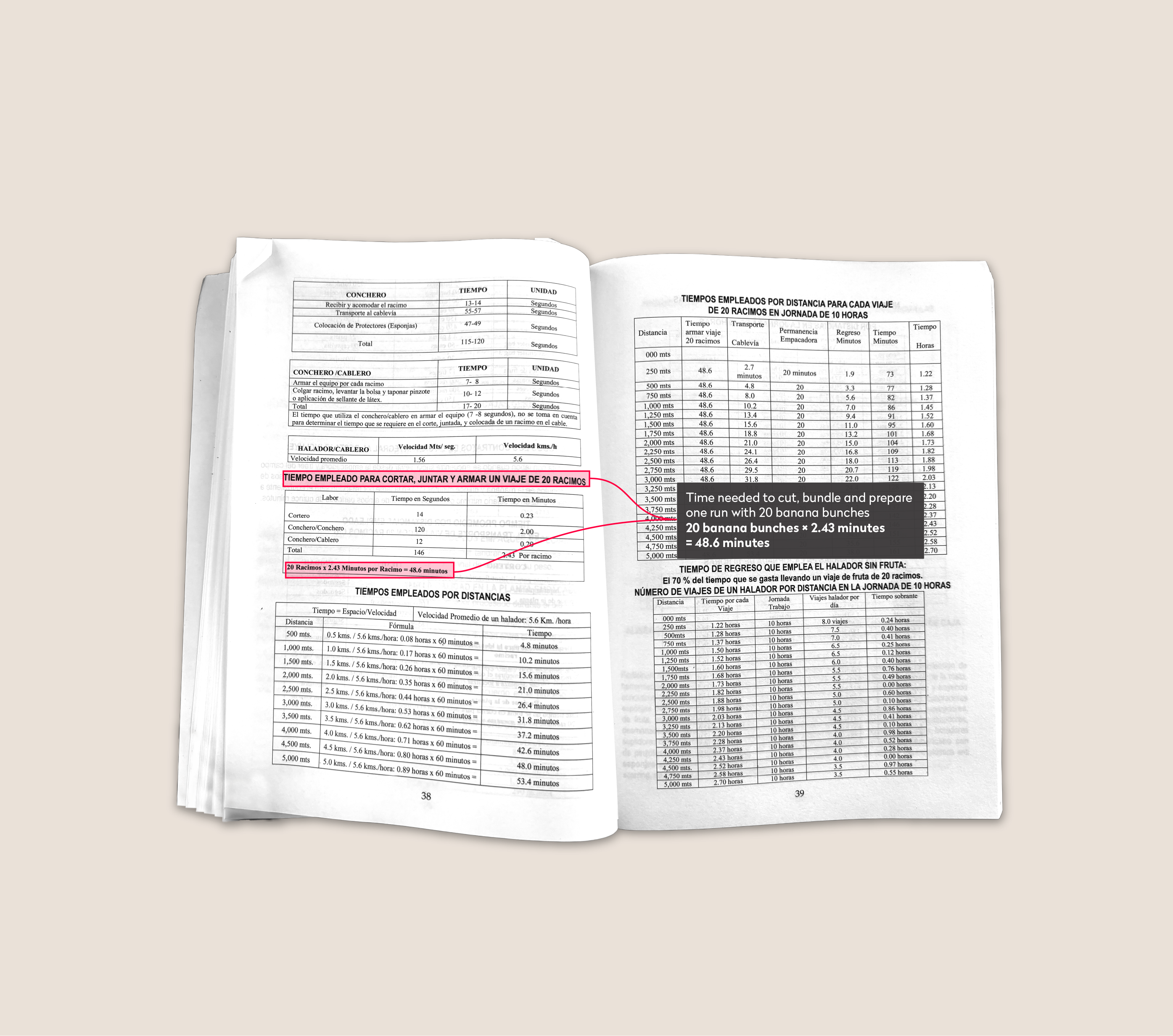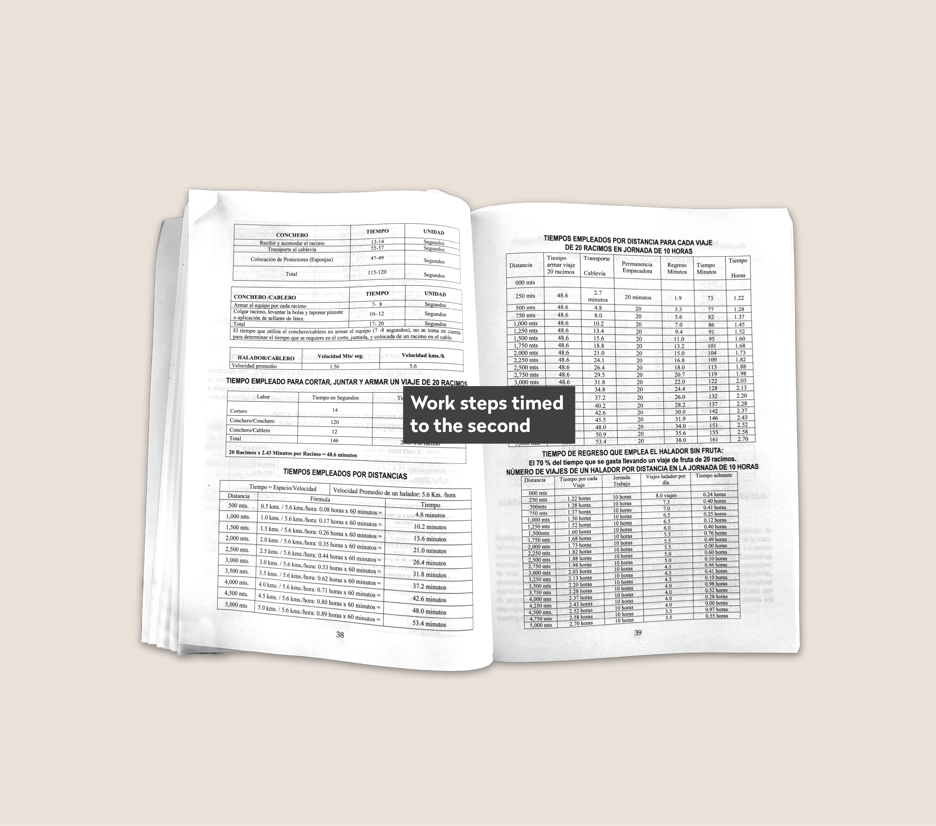 Attached by a belt, the hauler (halador) then pulls groups of 20 bunches towards the processing unit, where the fruit is sorted and stamped with the Chiquita label. The CBA states that he must cover 250 metres in 2.7 minutes – an average of 1.56 metres per second – hauling half a tonne of bananas. On some days, the distance can reach five kilometres, to be covered in 53.4 minutes.