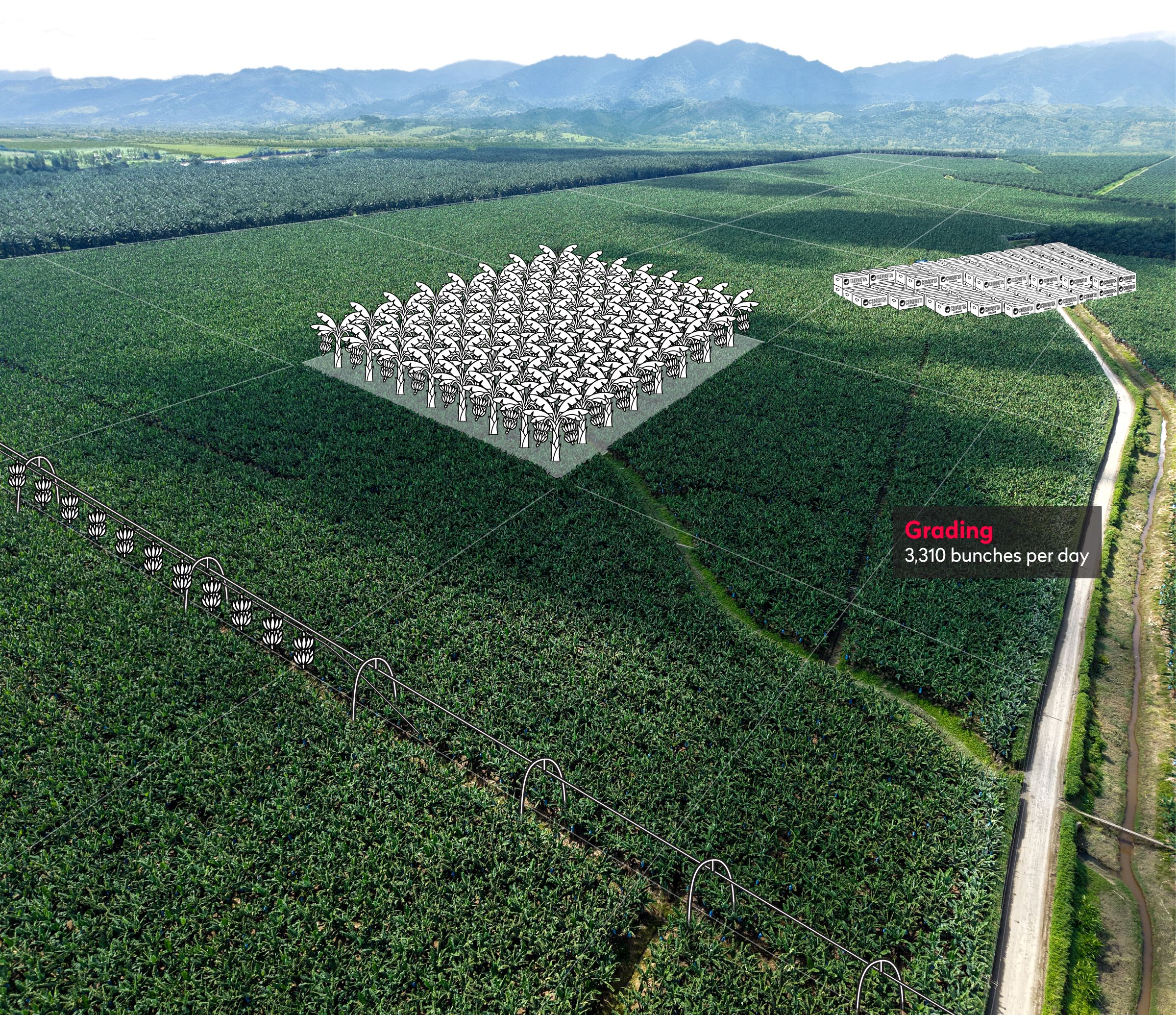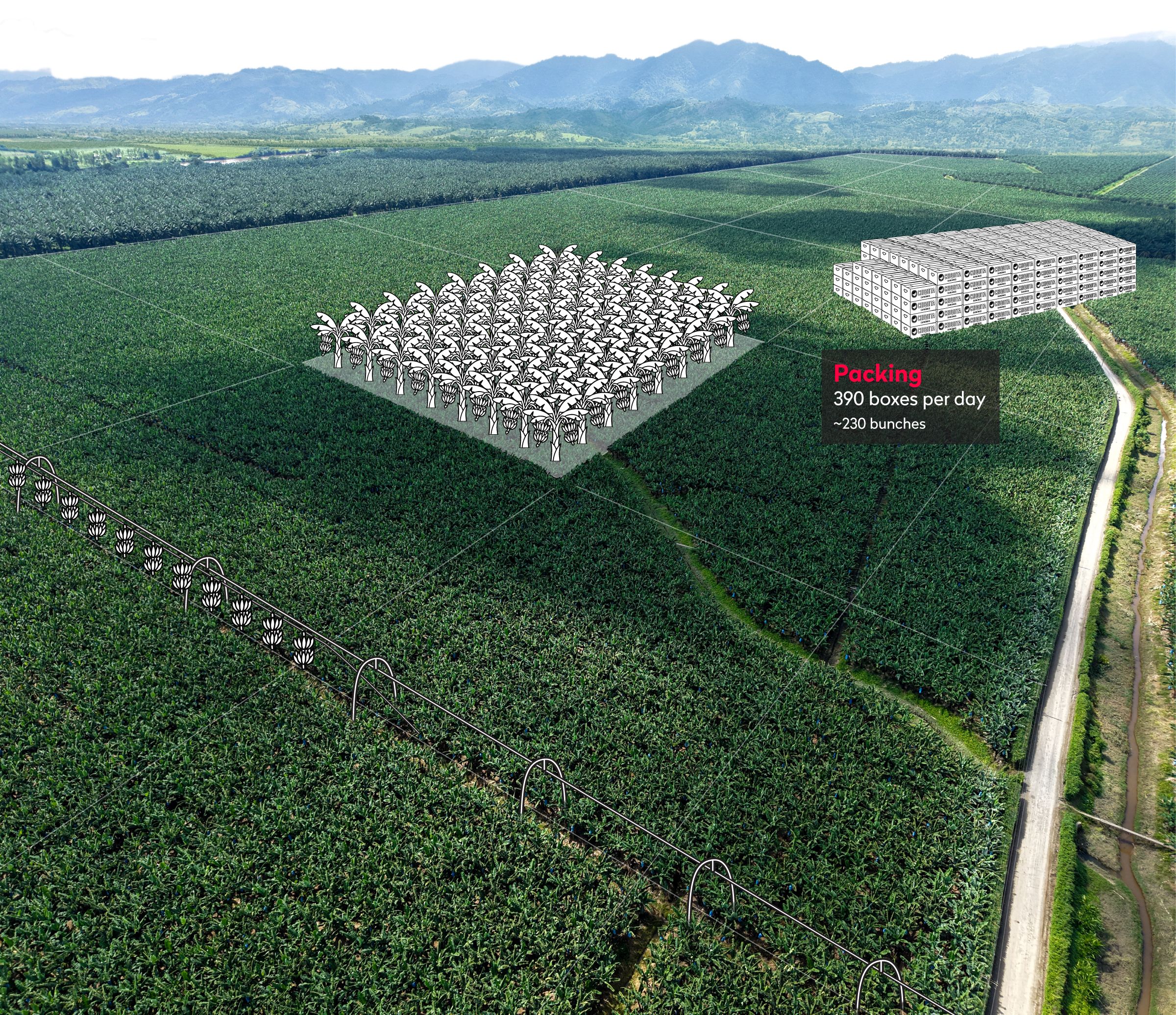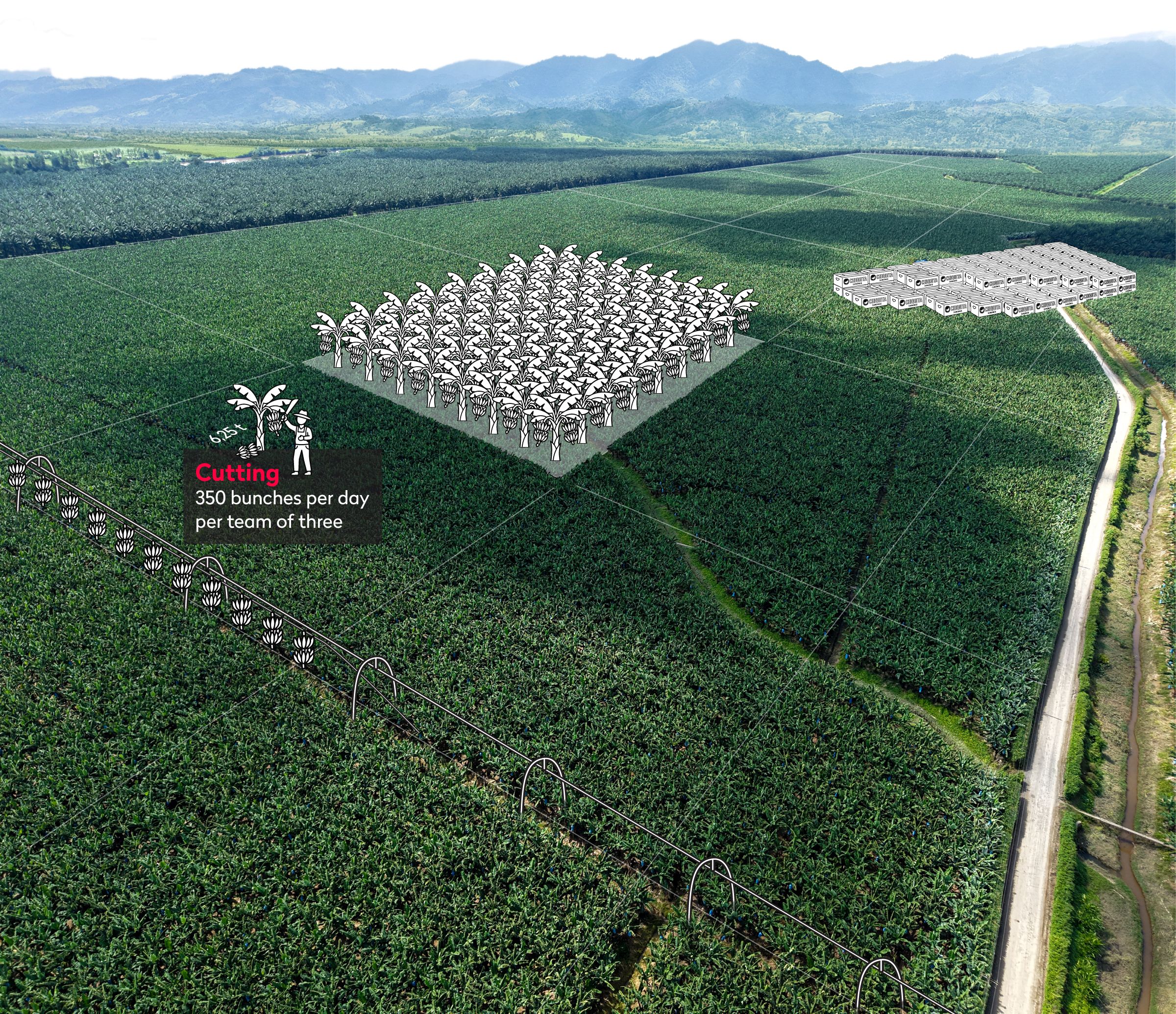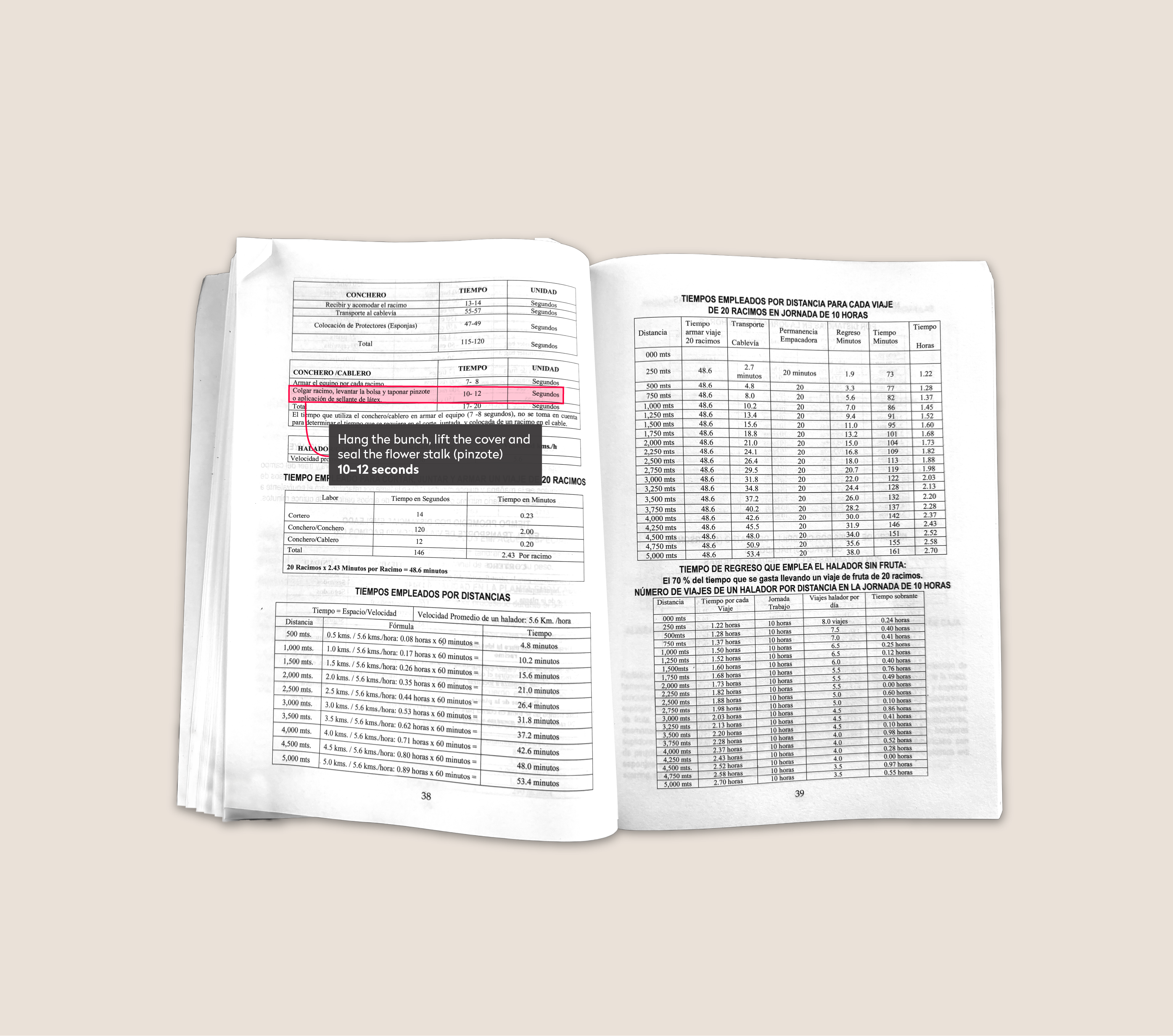 Attached by a belt, the hauler (halador) then pulls groups of 20 bunches towards the processing unit, where the fruit is sorted and stamped with the Chiquita label. The CBA states that he must cover 250 metres in 2.7 minutes – an average of 1.56 metres per second – hauling half a tonne of bananas. On some days, the distance can reach five kilometres, to be covered in 53.4 minutes.