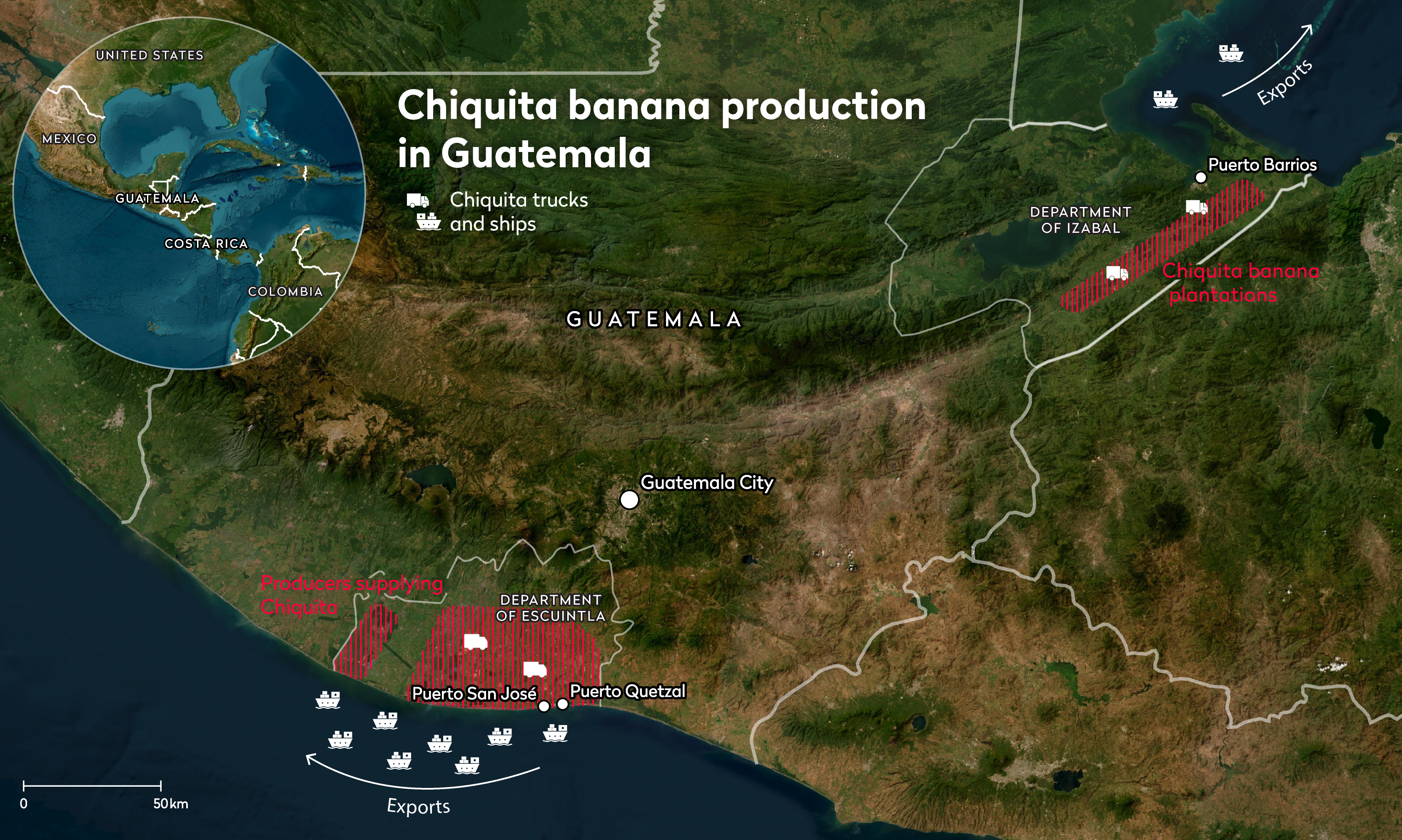 In November 2025, Public Eye travelled across Guatemala – tracing a diagonal line from the northeastern port city of Puerto Barrios to Puerto San José in the south – to document working and living conditions on plantations run by Chiquita, headquartered in the Swiss canton of Vaud since 2008, and its subcontractors.