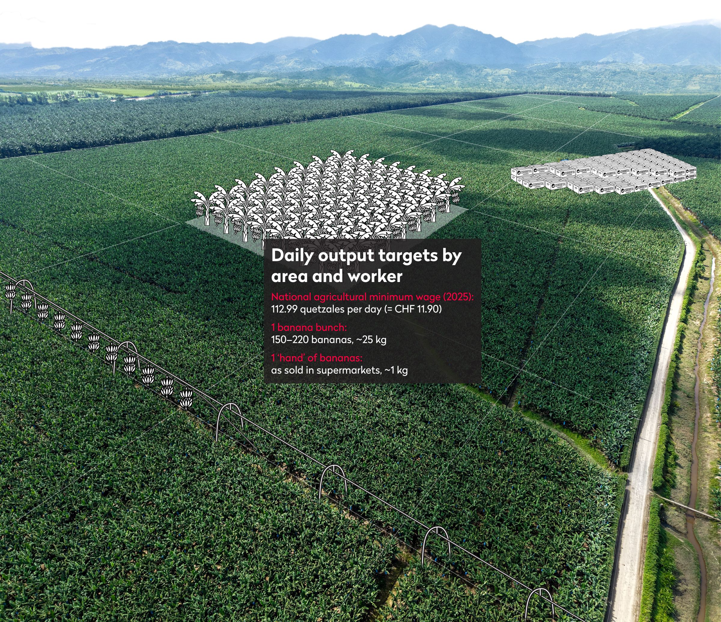 In Puerto Barrios, in the northeast, the nine area plantations are directly controlled by Chiquita. Here, 2,700 employees (20% on fixed-term contracts) earn barely one franc more per day than the minimum wage – provided they meet precisely defined output targets. These are set out in a collective bargaining agreement (CBA), a copy of which Public Eye has obtained.