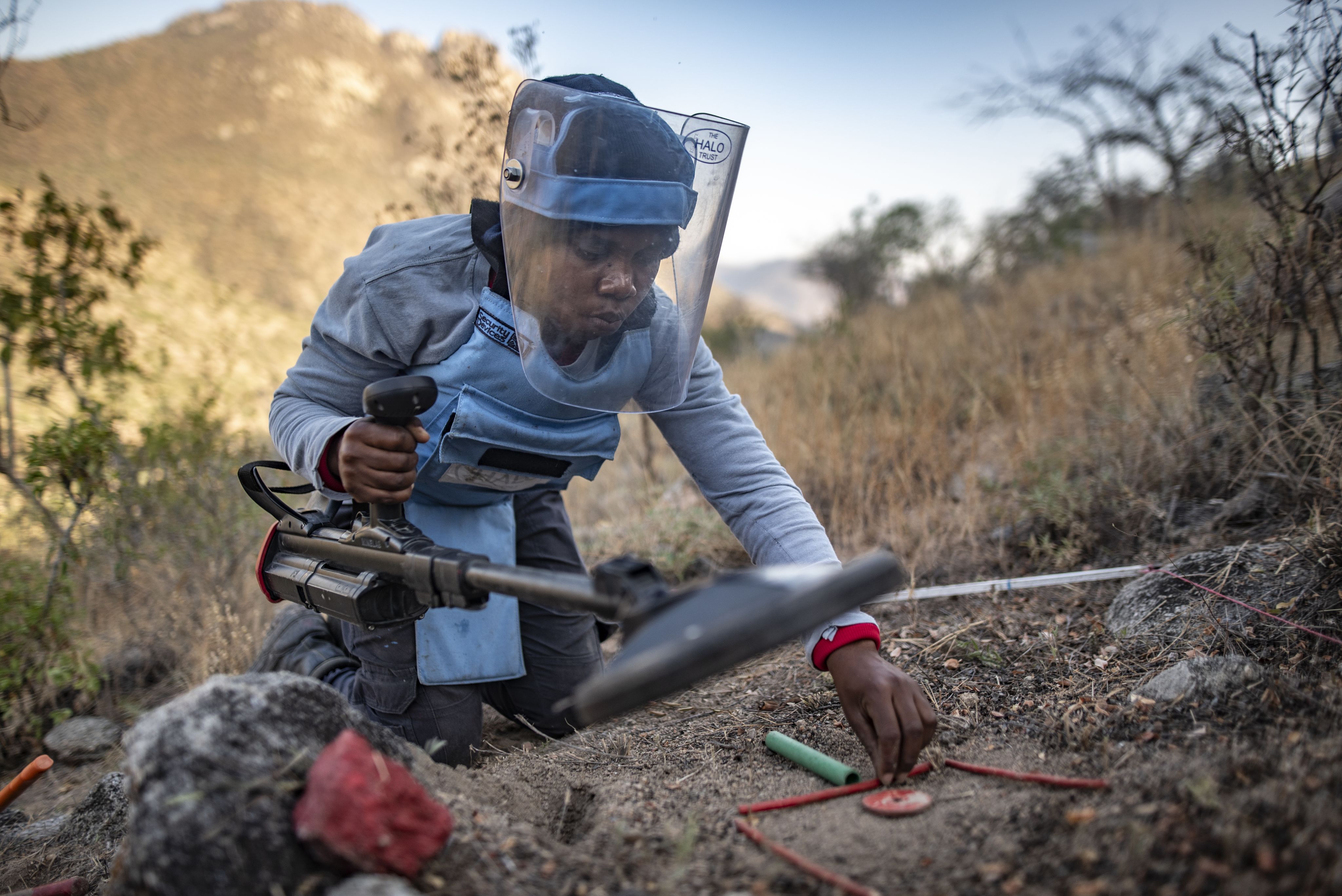 Image d’archive (mai 2022). Amelia Ngola, 30 ans, marque l'emplacement d'une mine terrestre présumée, avant de commencer à déterrer la surface.