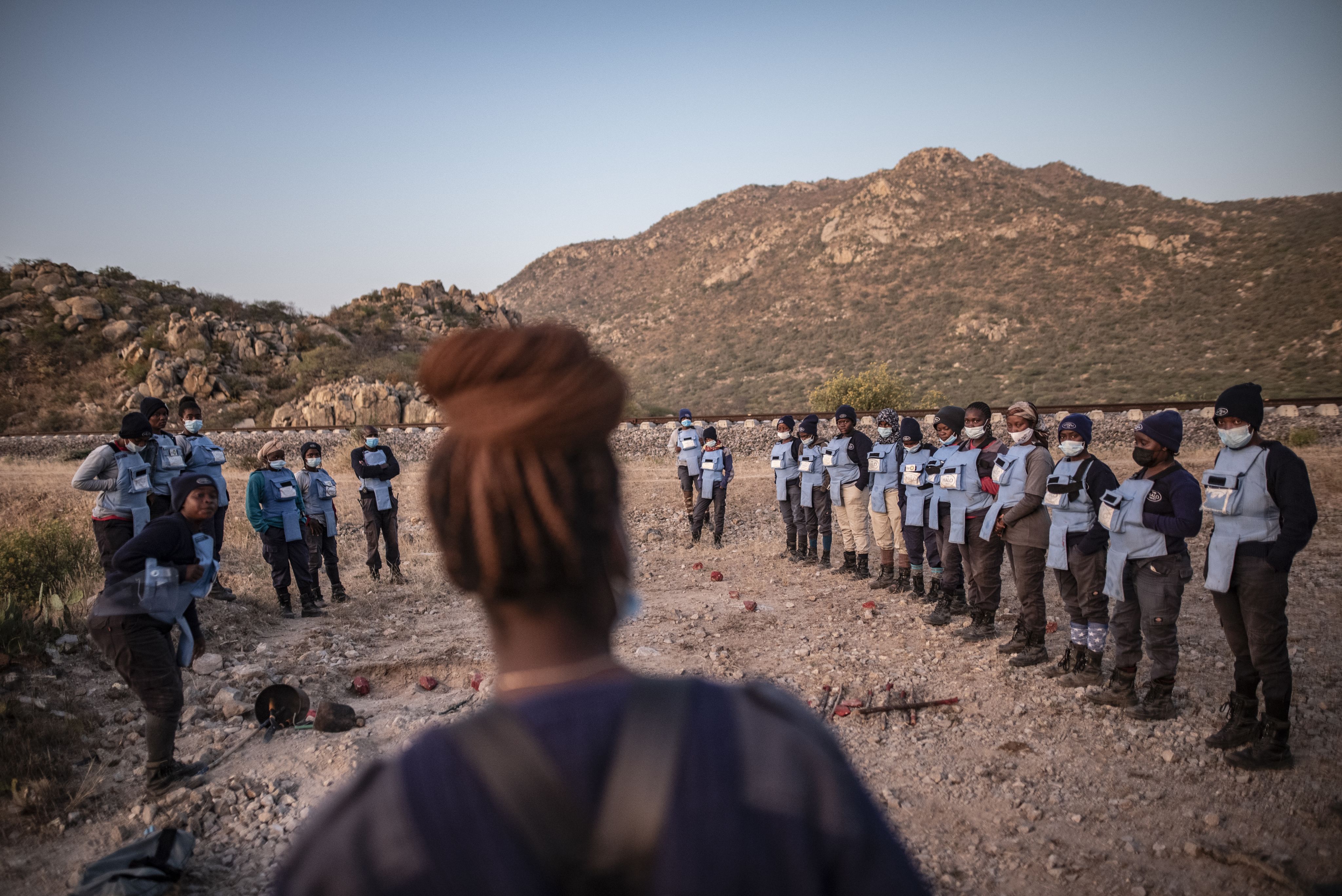 Archivbild (Mai 2022). Mitarbeiterinnen der NGO Halo Trust bereiten sich vor, um ein Feld in der Nähe von Bahngleisen in der Provinz Benguela von Minen zu befreien.